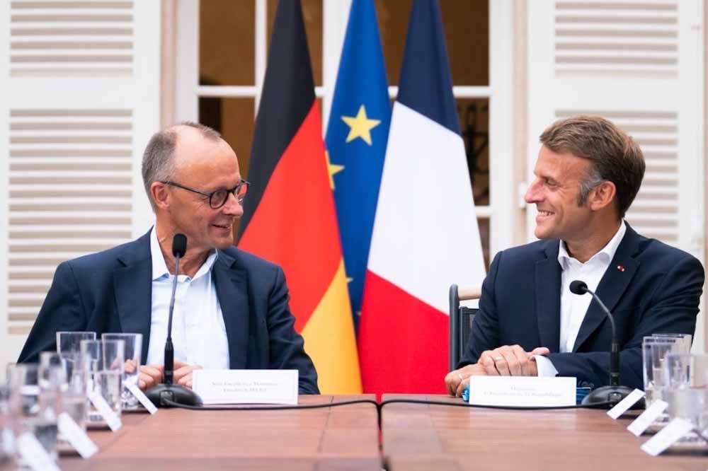 Ο Γάλλος πρόεδρος υποδέχτηκε τον Μερτς για ένα δείπνο εργασίας στο Φρούριο Μπρεγκανσόν της νότιας Γαλλίας, όπου έκαναν μια δήλωση στους δημοσιογράφους, πριν ξεκινήσουν τις μεταξύ τους συνομιλίες.
