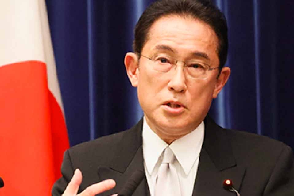 Κατά τη διάρκεια της θητείας του, ο απερχόμενος πρωθυπουργός στάθηκε αποφασιστικά στο πλευρό της Ουκρανίας μετά την εισβολή της Ρωσίας στο έδαφός της και συνέχισε, με την υποστήριξη των ΗΠΑ, την ενίσχυση της ιαπωνικής άμυνας με φόντο την άνοδο της ισχύος της Κίνας στην περιφέρεια Ασίας-Ειρηνικού.