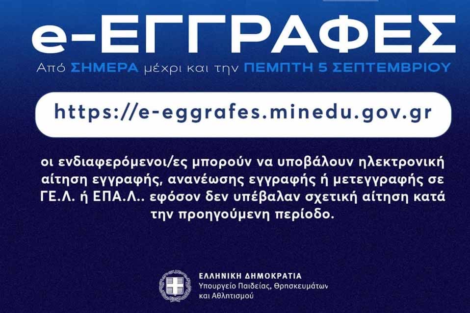 Από 2 Σεπτεμβρίου 2024 και ώρα 07.00 έως 5 Σεπτεμβρίου 2024 και ώρα 23.59, η ηλεκτρονική πλατφόρμα e-εγγραφές θα είναι σε λειτουργία προκειμένου να υποβληθούν κατ’ εξαίρεση Ηλεκτρονικές Αιτήσεις εγγραφής-ανανέωσης εγγραφής για ΓΕ.Λ – ΕΠΑ.Λ. από τους γονείς-κηδεμόνες των ανήλικων μαθητών/τριών ή τους/τις ίδιους/ες, εφόσον είναι ενήλικοι/ες, σε λειτουργούντα τμήματα.