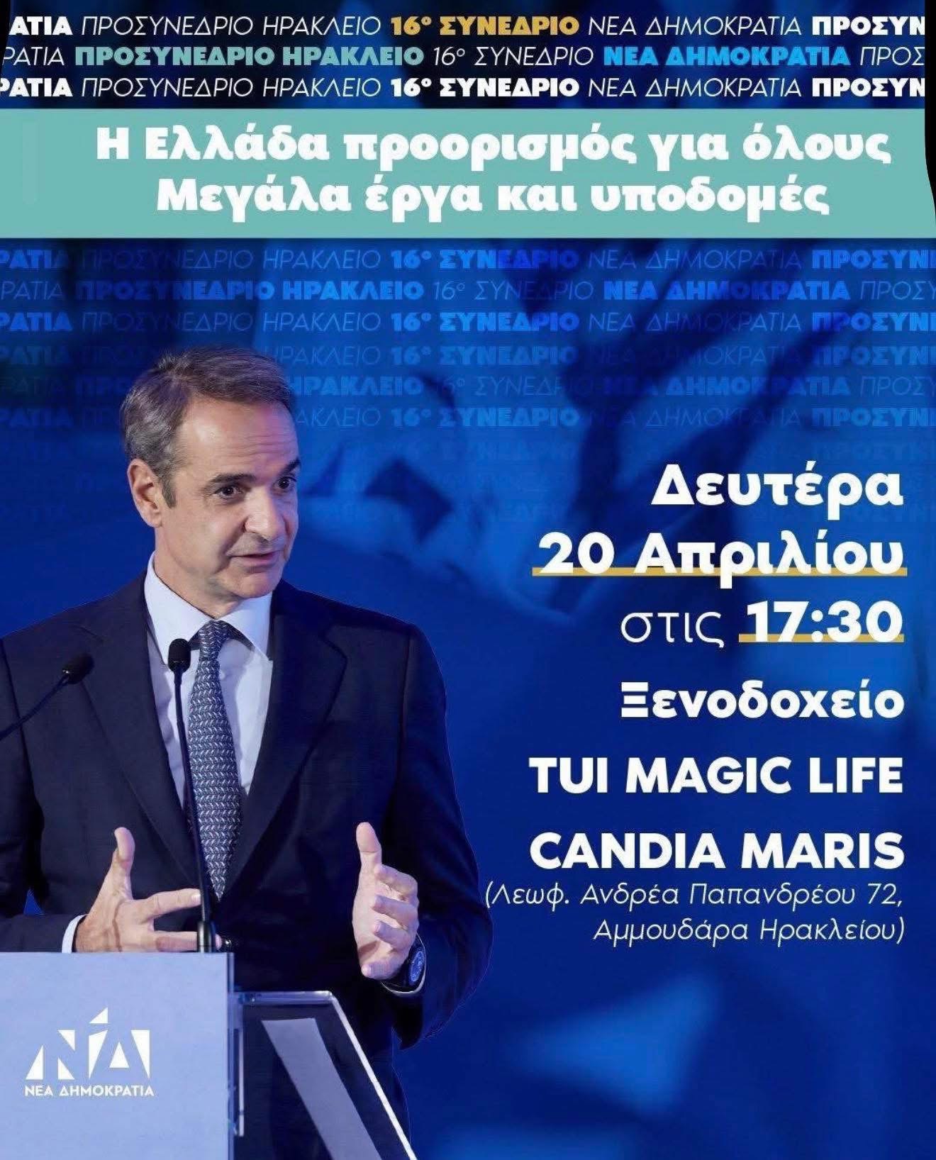 Το προσυνέδριο με θέμα «Ελλάδα προορισμός για όλους – Μεγάλα έργα και υποδομές», θα διεξαχθεί στο Ηράκλειο σήμερα Δευτέρα 20 Απριλίου, παρουσία του προέδρου της Νέας Δημοκρατίας και πρωθυπουργού Κυριάκου Μητσοτάκη.