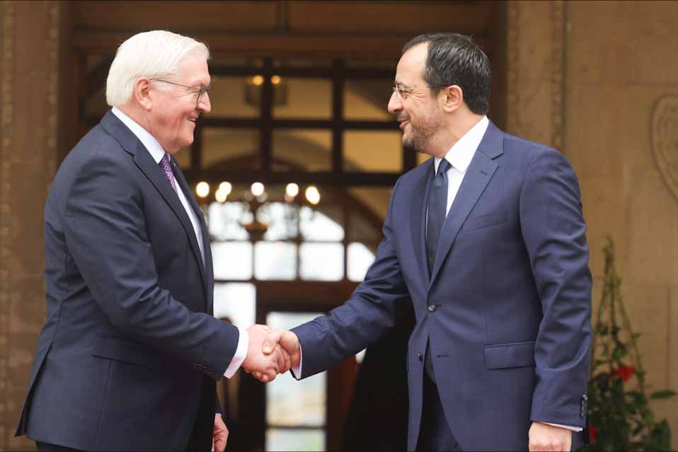 Μετά την κατ’ ιδίαν συνάντηση των δύο ηγετών ακολούθησαν διευρυμένες συνομιλίες των αντιπροσωπειών. Κατά την υποδοχή του ομοσπονδιακού Προέδρου, ο Νίκος Χριστοδουλίδης, αναδεικνύοντας τον ιστορικό χαρακτήρα της επίσκεψης, επισήμανε την 50ή επέτειο από την τουρκική εισβολή και τη συνεχιζόμενη κατοχή, καθώς και τη συμπλήρωση 20 ετών από την ένταξη της Κυπριακής Δημοκρατίας στην Ευρωπαϊκή Ένωση, τόνισε τις εξαιρετικές σχέσεις με τη Γερμανία και την ταύτιση των θέσεων των δύο χωρών σε πολλά περιφερειακά και διεθνή θέματα. «Επισκέπτεστε μια περιοχή η οποία αντιμετωπίζει σοβαρές προκλήσεις. Η Κύπρος, ο πλησιέστερος εταίρος της ΕΕ στην περιοχή, διατηρεί εξαιρετικές σχέσεις με όλες τις γειτονικές χώρες και προσπαθούμε να δημιουργούμε συνθήκες σταθερότητας», δήλωσε ο κύπριος Πρόεδρος και εξέφρασε την αισιοδοξία του για τη θετική έκβαση των διμερών συνομιλιών. «Βρισκόμαστε σε μια κρίσιμη καμπή στην ΕΕ και πρέπει να συζητήσουμε το μέλλον της ευρωπαϊκής μας οικογένειας. Η Κύπρος στηρίζει την ευρωπαϊκή ολοκλήρωση», ανέφερε ο κ. Χριστοδουλίδης και σημείωσε τη μακρά πείρα του κ. Σταϊνμάιερ, συμπεριλαμβανομένης της θητείας του ως υπουργού Εξωτερικών, κατά τη διάρκεια της οποίας επισκέφθηκε μάλιστα δύο φορές την Κύπρο, όπως είπε ο ίδιος.