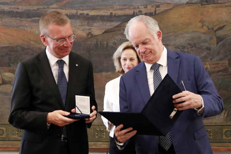 «Ως εκδήλωση τιμής και αναγνώρισης αμοιβαίων αισθημάτων φιλίας» ο Πρόεδρος της Βουλής απένειμε στον Πρόεδρο της Λετονίας το χρυσό μετάλλιο της Βουλής των Ελλήνων, που εκδόθηκε με αφορμή τη συμπλήρωση των 200 χρόνων από την Ελληνική Επανάσταση του 1821 και απεικονίζει τη μορφή της θεάς Αθηνάς σε σφραγίδα του νεοσύστατου ελληνικού κράτους, συνοδευόμενο από τον αντίστοιχο συνοδευτικό πάπυρο.