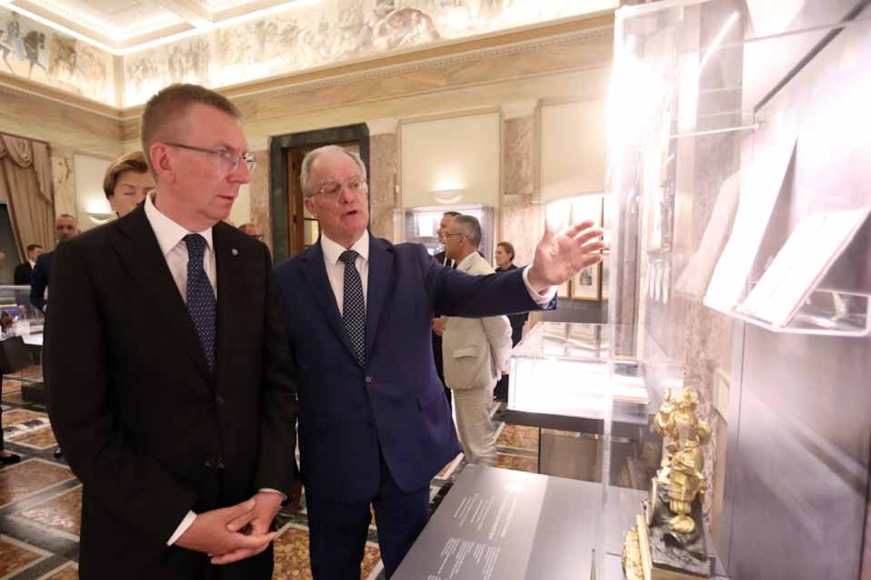 Μετά τη συνάντηση ο Πρόεδρος της Λετονίας μαζί με την αντιπροσωπεία του ξεναγήθηκε, συνοδεία του Προέδρου της Βουλής, στην Έκθεση «Αντικρίζοντας την Ελευθερία! Στη Βουλή των Ελλήνων, δύο αιώνες μετά».
