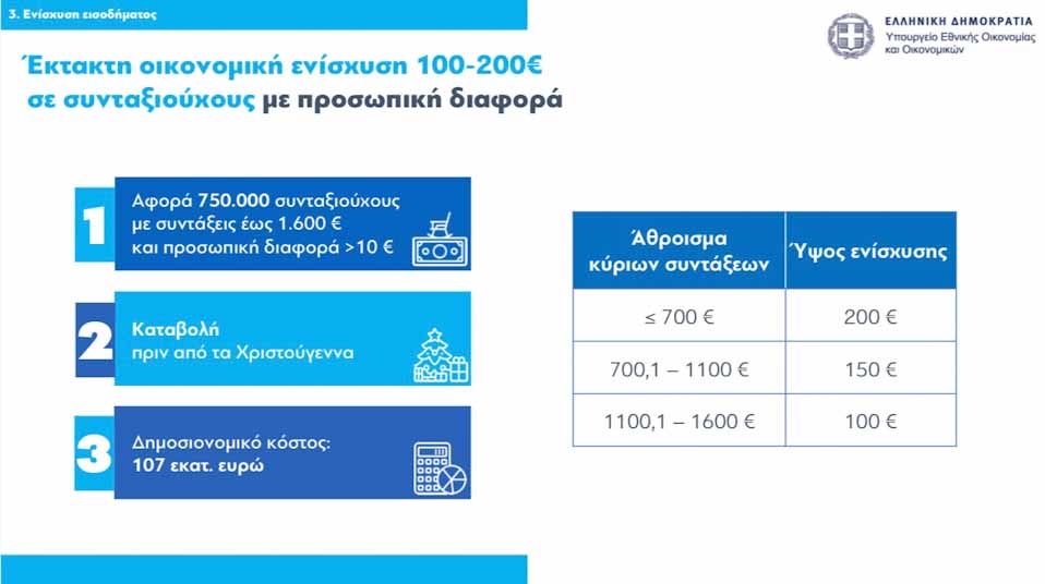 2. Για 750.000 περίπου συνταξιούχους με συντάξεις έως 1.600 ευρώ, που έχουν προσωπική διαφορά (άνω των 10 ευρώ), θα δοθεί στα τέλη Δεκεμβρίου 2023 έκτακτη οικονομική ενίσχυση από 100 έως 200 ευρώ. Το δημοσιονομικό κόστος εκτιμάται σε περίπου 107 εκατ. ευρώ. Πιο συγκεκριμένα: