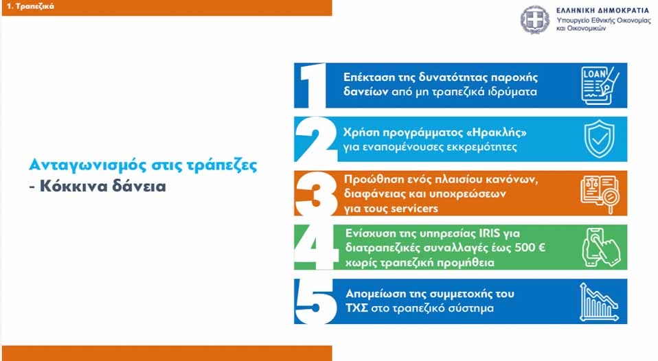 - Δεύτερον: ενίσχυση του ανταγωνισμού στο τραπεζικό σύστημα, με στόχο τη μείωση της ψαλίδας μεταξύ των επιτοκίων χορηγήσεων και των επιτοκίων καταθέσεων. Βασικό εργαλείο στην κατεύθυνση αυτή θα είναι η δυνατότητα χορήγησης στεγαστικών και επιχειρηματικών δανείων και από μη τραπεζικά ιδρύματα – υπό την εποπτεία πάντοτε της Τράπεζας της Ελλάδος – που θα υλοποιηθεί με την προώθηση σχετικής νομοθεσίας.