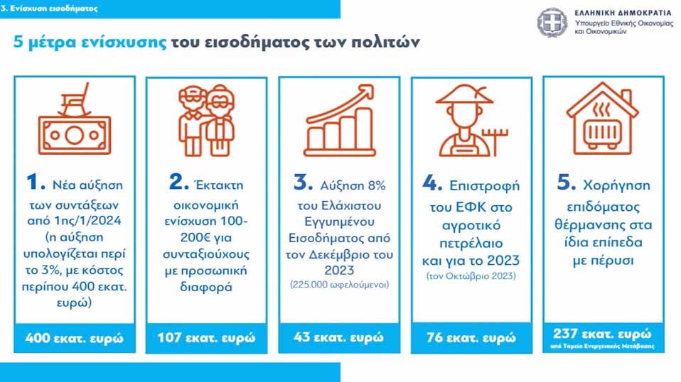 3. Από τον Δεκέμβριο του 2023 αυξάνεται κατά 8% τοελάχιστο εγγυημένο εισόδημα. Αφορά περί τους 225.000 ωφελούμενους του ελάχιστου εγγυημένου εισοδήματος. Το ετήσιο κόστος ανέρχεται σε περίπου 43 εκατ. ευρώ ετησίως (περί τα 3,5 εκατ. ευρώ για τον Δεκέμβριο 2023).