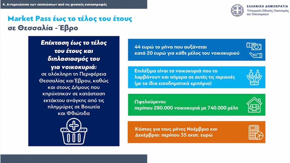 13. Το Market Pass επεκτείνεται έως το τέλος του έτους στη Θεσσαλία και τις υπόλοιπες πληγείσες περιοχές από τις πλημμύρες αλλά και για τον Έβρο και διπλασιάζεται (από 22 ευρώ το μήνα για μονοπρόσωπο νοικοκυριό που αυξάνεται κατά 10 ευρώ για κάθε επιπλέον μέλος του νοικοκυριού, θα ανέλθει σε 44 ευρώ το μήνα που αυξάνεται κατά 20 ευρώ για κάθε μέλος του νοικοκυριού). Επιλέξιμα είναι τα νοικοκυριά που το λαμβάνουν και σήμερα (με τα ίδια εισοδηματικά κριτήρια) σε ολόκληρη τη Περιφέρεια Θεσσαλίας και Έβρου, καθώς και στις περιοχές που κηρύχτηκαν σε κατάσταση εκτάκτου ανάγκης από τις πλημμύρες σε Βοιωτία και Φθιώτιδα. Ωφελούμενοι είναι περίπου 280.000 νοικοκυριά με 740.000 μέλη και το κόστος για τους μήνες Νοέμβριο και Δεκέμβριο υπολογίζεται σε περίπου 35 εκατ. ευρώ.