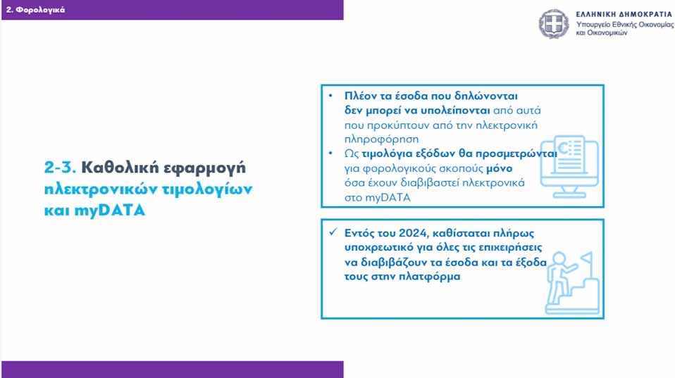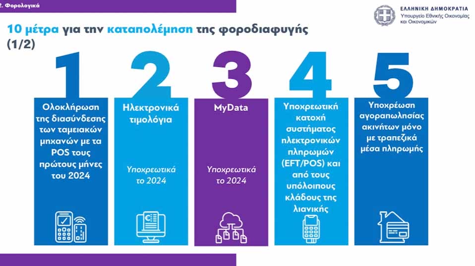 3. Εφαρμόζονται καθολικά τα ηλεκτρονικά βιβλία (myDATA). Τα έσοδα που δηλώνονται δεν μπορεί να υπολείπονται από αυτά που προκύπτουν από την ηλεκτρονική πληροφόρηση (myDATA, ταμειακές-POS), ενώ ως τιμολόγια εξόδων θα προσμετρώνται για φορολογικούς σκοπούς μόνο όσα έχουν διαβιβαστεί ηλεκτρονικά στο myDATA. Η επέκταση του myDATA βρίσκεται σε εξέλιξη και η πλήρης εφαρμογή θα ολοκληρωθεί εντός του 2024.