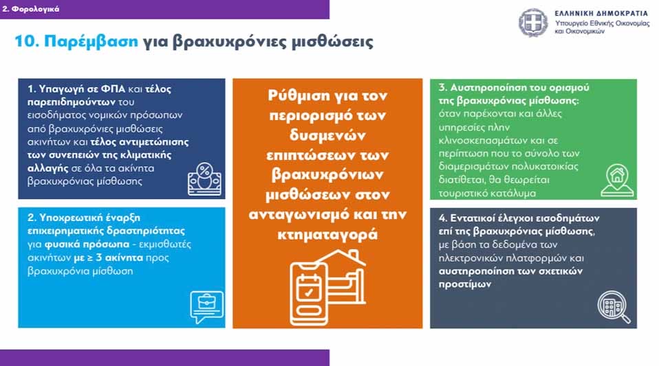 3. Υποχρέωση έναρξης επιχειρηματικής δραστηριότητας για φυσικά πρόσωπα που διαθέτουν σε ψηφιακή πλατφόρμα τρία ή περισσότερα προς εκμίσθωση/υπεκμίσθωση για σκοπούς βραχυχρόνιας μίσθωσης. Με την συγκεκριμένη παρέμβαση οι ιδιώτες που αναρτούν προς μίσθωση (ή υπεκμίσθωση) τρία ή περισσότερα ακίνητα σε ψηφιακή πλατφόρμα, θα καθίστανται επιχειρήσεις (ατομική ή νομικό πρόσωπο) και θα υποχρεούνται σε έναρξη όπως υποχρεούνται ήδη τα νομικά πρόσωπα που ασκούν την συγκεκριμένη δραστηριότητα, (με ανάλογες ασφαλιστικές εισφορές, τέλος επιτηδεύματος και ΦΠΑ από το πρώτο ακίνητο).