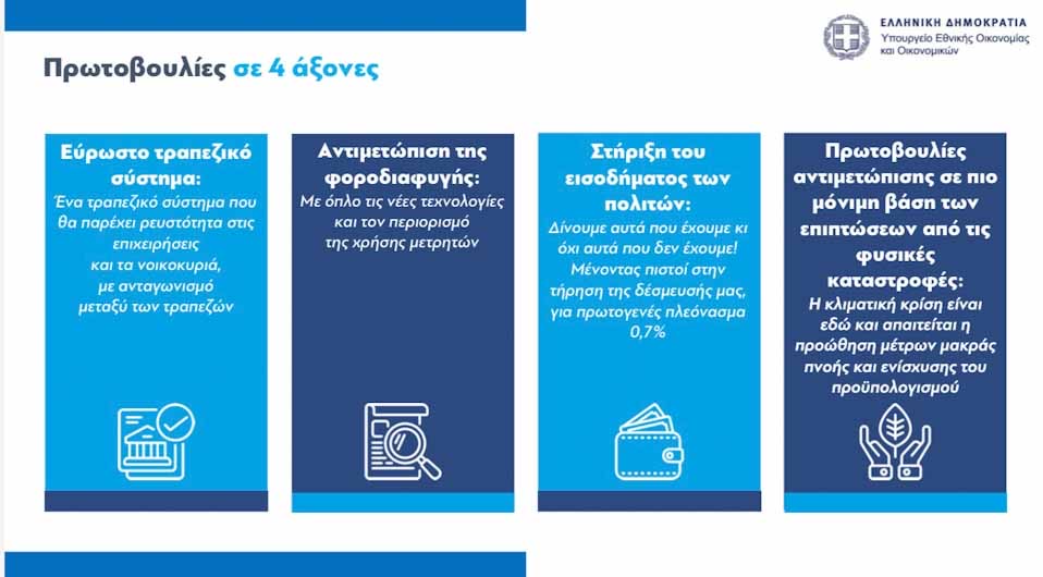 Ο Υπουργός Εθνικής Οικονομίας και Οικονομικών,Κωστής Χατζηδάκης, οι Υφυπουργοί Χάρης Θεοχάρης και Θάνος Πετραλιάς και ο Διοικητής της ΑΑΔΕ Γιώργος Πιτσιλής, προχώρησαν σήμερα σε εξειδίκευση του πλαισίου της οικονομικής και φορολογικής πολιτικής που παρουσίασε ο πρωθυπουργός κ. Κυριάκος Μητσοτάκης στο πλαίσιο της 87ης ΔΕΘ.