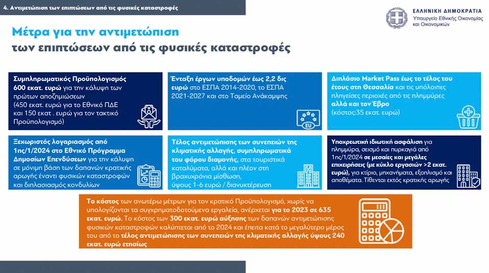 3. Δημιουργείται από 1/1/2024 ξεχωριστός λογαριασμός στο Εθνικό Πρόγραμμα Δημοσίων Επενδύσεων που θα καλύπτει σε μόνιμη βάση τις δαπάνες κρατικής αρωγής έναντι φυσικών καταστροφών. Αυξάνεται το ύψος των διαθέσιμων κονδυλίων για αυτόν τον λογαριασμό από 300 εκατ. ετησίως που σήμερα βρίσκονται στο Πρόγραμμα Κρατικής Αρωγής, σε 600 εκατ. ευρώ ετησίως (αύξηση κατά 300 εκατ. ευρώ), για να καλύψει τόσο τις υπόλοιπες αποζημιώσεις της τρέχουσας καταστροφής αλλά και για να καλύπτει μελλοντικές καταστροφές τα επόμενα έτη.