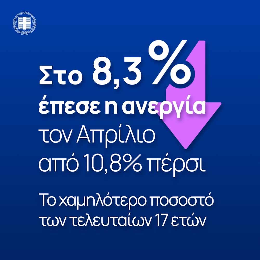 «Η ανεργία υποχωρεί σταθερά και μαζί της υποχωρούν και οι ανισότητες στην αγορά εργασίας: η ανεργία των γυναικών μειώθηκε στο 10,8% από 13,6% πέρσι τον Απρίλιο, ενώ των νέων στο 20,4% από 24,2% πέρσι. Συνεχίζουμε με περισσότερες και καλύτερες δουλειές για όλους», αναφέρεται σε ανάρτηση της ελληνικής κυβέρνησης για τη μείωση της ανεργίας στο 8,3% τον Απρίλιο.
