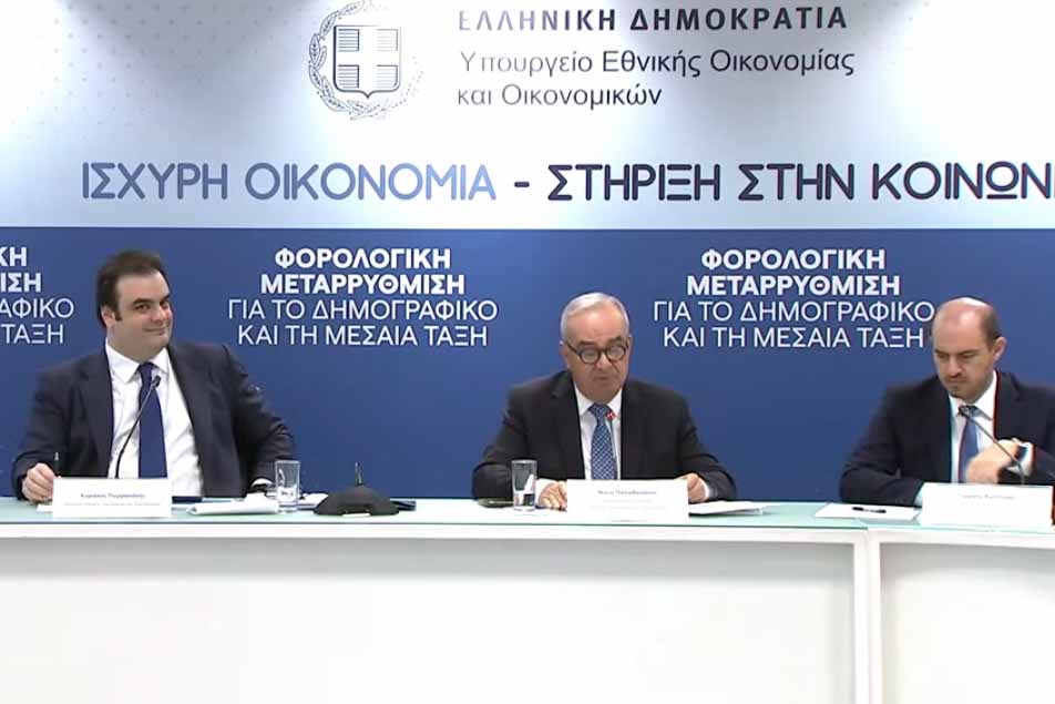 Είναι δηλαδή μια εντελώς διαφορετική αρχιτεκτονική φορολογίας, η οποία ευελπιστούμε ότι θα καθορίσει θετικά την πορεία της χώρας τα επόμενα χρόνια. Βλέπετε, άλλωστε, δίπλα μου τον τίτλο που συμπυκνώνει τη φιλοσοφία με την οποία κινηθήκαμε για να δομήσουμε αυτά τα μέτρα: Φορολογική μεταρρύθμιση για το δημογραφικό και τη μεσαία τάξη.
