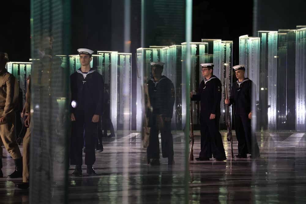Κατά την τελετή των αποκαλυπτηρίων έλαβε χώρα δρώμενο σε σκηνοθετική επιμέλεια της Σοφίας Σπυράτου και της καλλιτεχνικής της ομάδας. Αφηγητές της εκδήλωσης ήταν η Άντζελα Γκερέκου και ο Άρης Σακελλαρίδης, με ερμηνευτές τους Μανώλη Μητσιά και Άγγελο Παπαδημητρίου, υπό τη μουσική διεύθυνση του Αρχιμουσικού Πλωτάρχη Ευστράτιου Σίτσα ΠΝ και συνοδεία τμήματος της Διακλαδικής Μπάντας των Ενόπλων Δυνάμεων. Το σενάριο και τα κείμενα είχε επιμεληθεί ο Λάμπρος Λιάβας, ενώ την ενδυματολογική επιμέλεια είχε η Ντέμη Βαλθιώτη. Στο δρώμενο συμμετείχαν και σπουδαστές της Στρατιωτικής Σχολής Ευελπίδων, της Στρατιωτικής Σχολής Ναυτικών Δοκίμων, της Σχολής Ικάρων και της Σχολής Ναυτικών Αξιωματικών.
