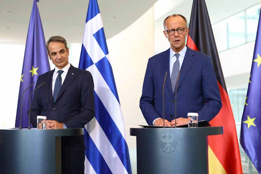 Ο Πρωθυπουργός Κυριάκος Μητσοτάκης είχε σήμερα κατ’ ιδίαν συνάντηση στο Βερολίνο με τον Καγκελάριο της Γερμανίας Friedrich Merz. Ακολούθησαν διευρυμένες συνομιλίες των αντιπροσωπειών των δύο χωρών και στη συνέχεια οι δύο ηγέτες παραχώρησαν κοινή συνέντευξη Τύπου.
