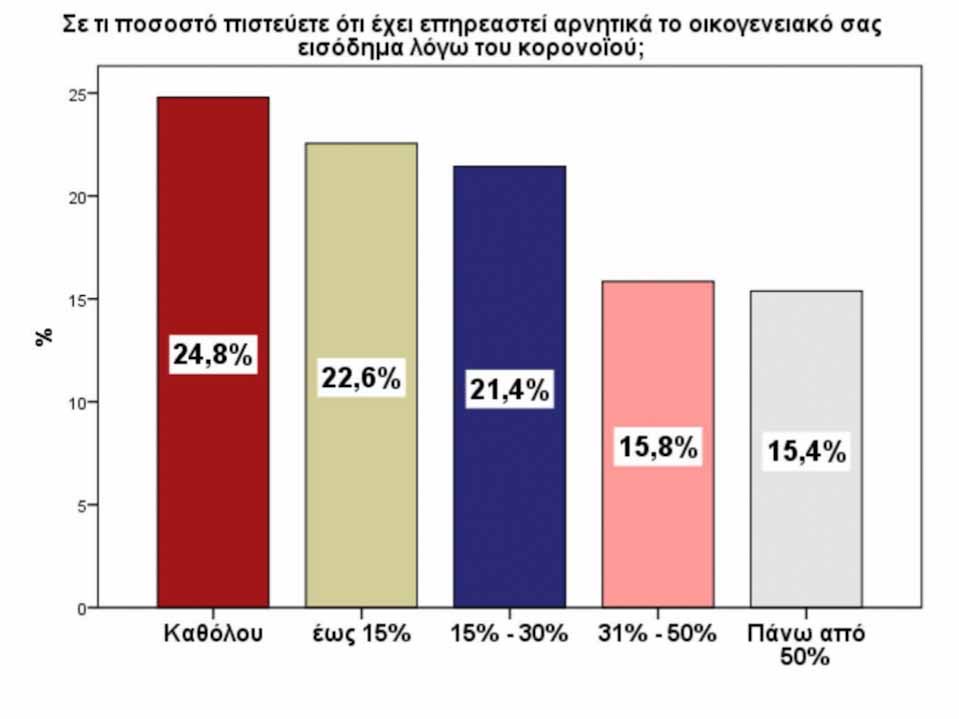 Στην ερώτηση κατά πόσο έχει επηρεαστεί αρνητικά το οικογενειακό τους εισόδημα λόγω COVID-19, το 24,8% δήλωσε καθόλου, το 22,6% δήλωσε έως 15%, το 21,4% δήλωσε από 15-30%, το 15,8% δήλωσε από 31-50% και το 15,4% πάνω από 50%.