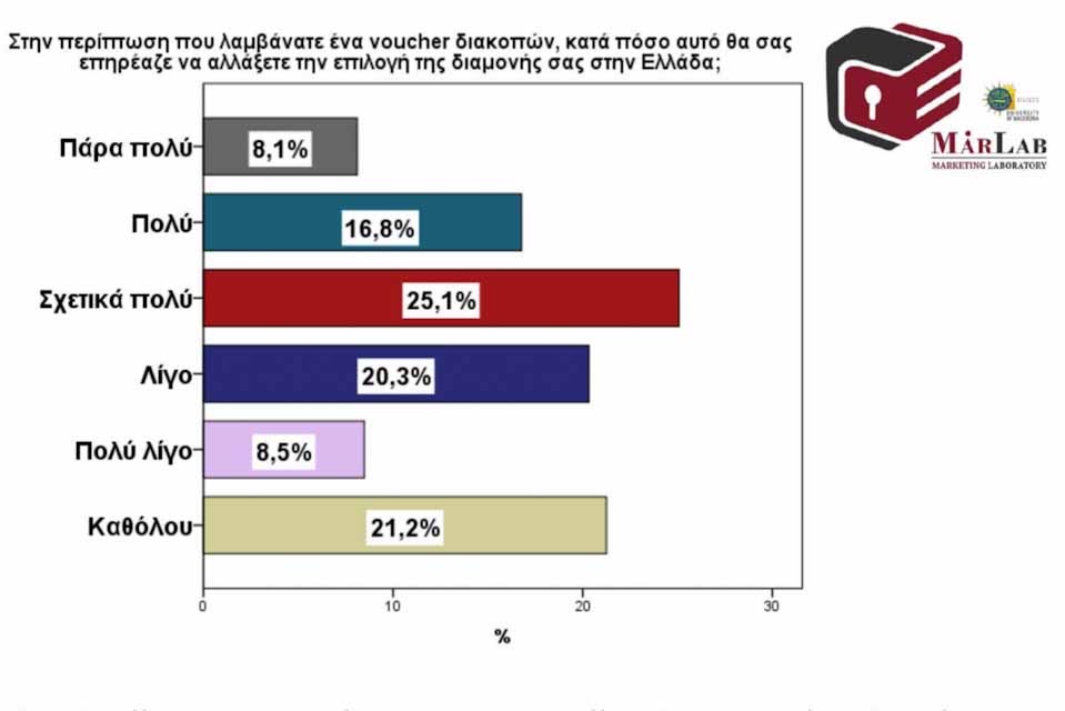 • Η παροχή voucher μπορεί να διαφοροποιήσει περισσότερο την επιλογή του προορισμού των διακοπών των Ελλήνων, λιγότερο την περίοδο και ακόμα λιγότερο το είδος της διαμονής τους.