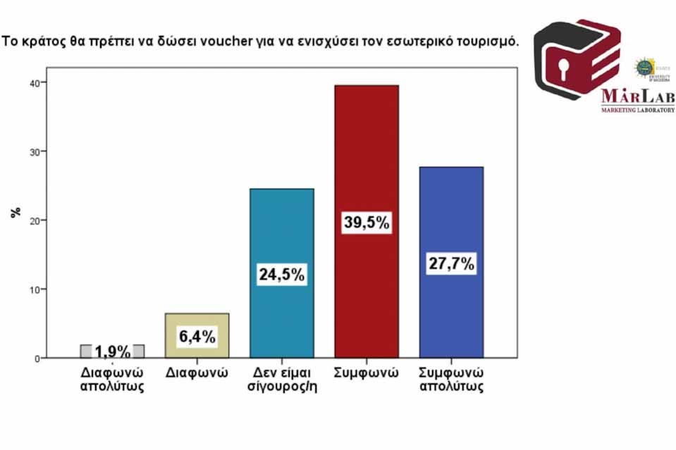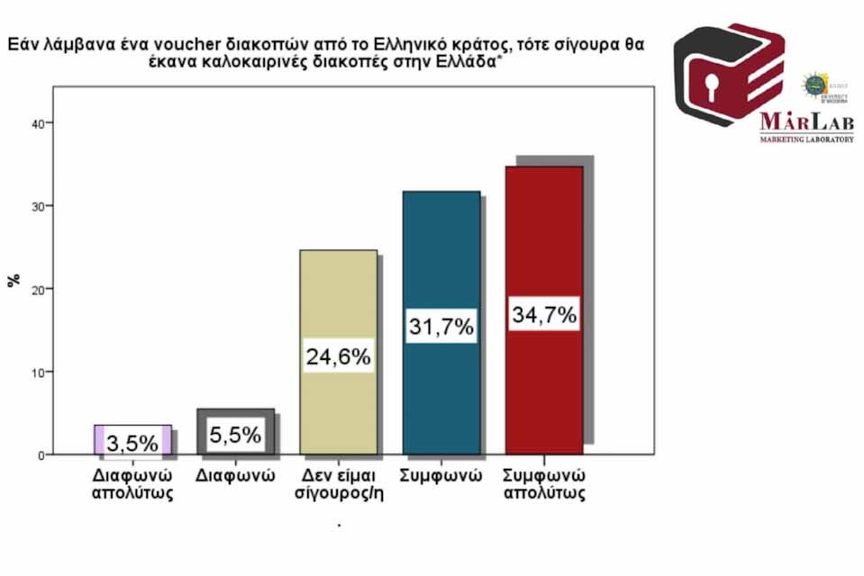 Με την πρόταση «Εάν λάμβανα ένα voucher διακοπών από το Ελληνικό κράτος, τότε σίγουρα θα έκανα διακοπές στην Ελλάδα», συμφωνεί σε απόλυτα ή σε μεγάλο βαθμό το 66,4% των ερωτηθέντων, ενώ μόνο ένα 9% αυτών διαφωνεί με αυτό. Παρόλα αυτά είναι αξιοσημείωτο ότι το 24,6% των ερωτηθέντων δεν είναι σίγουρο ακόμη και σε αυτή την περίπτωση.