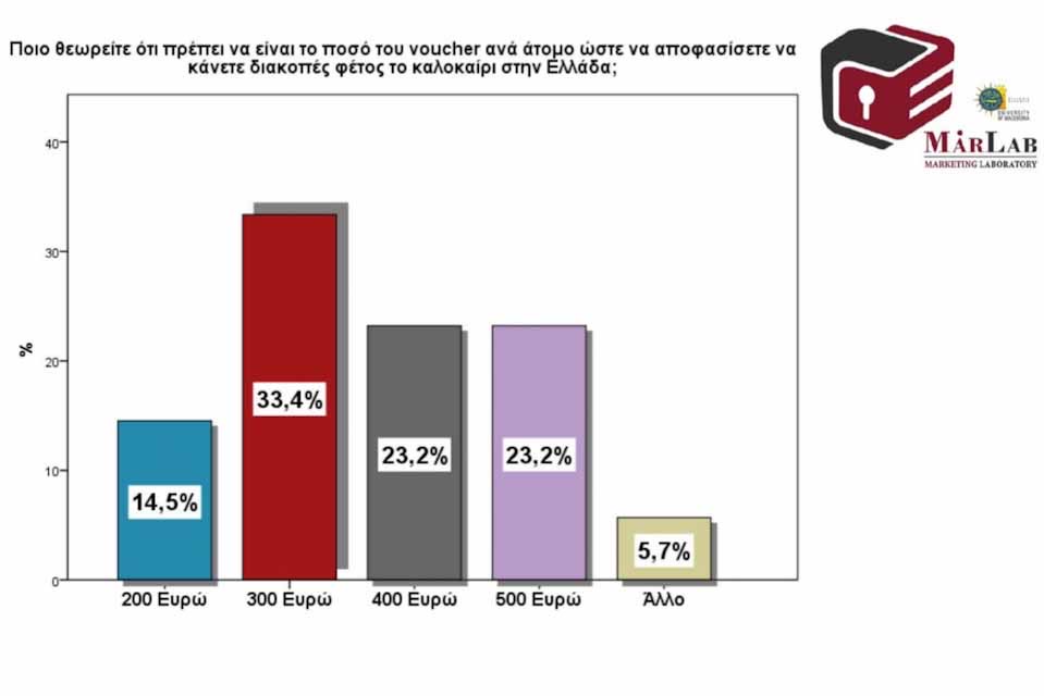 Οι αντιλήψεις σχετικά με τα επίπεδα του ποσού του voucher διακοπών ποικίλουν ανάμεσα στους ερωτηθέντες. Το 14,5% δηλώνει ότι θα ήταν ικανοποιητικό το ποσό των 200 Ευρώ, το 33,4% των ερωτηθέντων θεωρεί πως ένα voucher των 300 Ευρώ είναι ικανοποιητικό, ενώ 23,2% θεωρεί πως αυτό το voucher θα πρέπει να είναι στο ποσό των 400 Ευρώ. Τέλος, υπάρχει ένα ποσοστό 23% που θεωρεί πως το ποσό πρέπει να κυμανθεί υψηλότερα και συγκεκριμένα στα 500 Ευρώ.