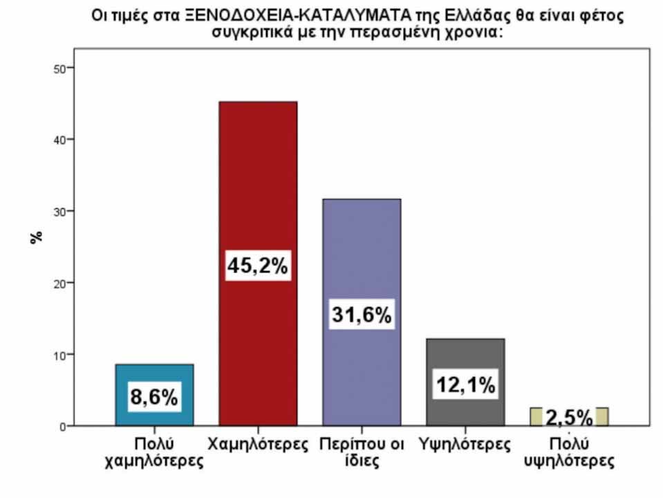 • Οι Έλληνες στην πλειοψηφία τους αναμένουν πτώση στις τιμές των ξενοδοχείων ενώ θεωρούν ότι οι τιμές των εστιατορίων θα παραμείνουν ίδιες κατά τη διάρκεια των καλοκαιρινών τους διακοπών