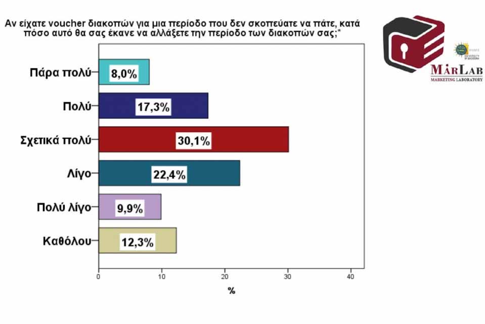 Το voucher είναι πολύ πιθανό να αλλάξει την περίοδο διακοπών για το 55,4% των ερωτηθέντων ενώ το 32,3% αυτών ισχυρίζεται ότι θα επηρεαστεί μόνο λίγο ή πολύ λίγο. Τέλος, το 12,3% των ερωτηθέντων υποστηρίζει ότι δεν θα επηρεαστεί καθόλου η επιλογή του για την περίοδο διακοπών του λόγω voucher. Η τάση εδώ δείχνει πως το voucher διακοπών είναι πιο δύσκολο να επηρεάσει την περίοδο διακοπών από ότι τον προορισμό, γεγονός που μπορεί να οφείλεται και σε άλλους εξωγενείς παράγοντες (π.χ. δυνατότητα άδειας).
