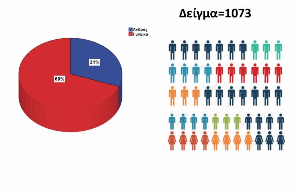 ΤΟ ΠΡΟΦΙΛ ΤΟΥ ΔΕΙΓΜΑΤΟΣ: Στο ερωτηματολόγιο απάντησαν 1073 άτομα εκ των οποίων το 31% ήταν άντρες και το 69% γυναίκες. Σε ότι αφορά στην ηλικία, το 62% του δείγματος ήταν ηλικίας 20-40 ετών, το 34% ήταν μεταξύ 41-65 ετών, και το υπόλοιπο 4% ήταν κάτω των 20 ετών. Το 40% του δείγματος ήταν έγγαμοι/ες, το 53% ήταν άγαμοι/ες, το 6% διαζευγμένοι/ες και το 1% χήροι/ες. Σε ότι αφορά στο εισόδημα, το 26,5% δήλωσε εισόδημα μικρότερο των 10.000 Ευρώ, το 33,6% μεταξύ 10.001 και 20.000 Ευρώ, το 22% μεταξύ 20.001 και 30.000 Ευρώ, το 10,4% μεταξύ 30.001 και 40.000 Ευρώ και το υπόλοιπο 7,5% μεγαλύτερο από 40.001 Ευρώ. Το δείγμα ήταν πανελλαδικό, προερχόμενο από 47 διαφορετικούς νομούς της χώρας.