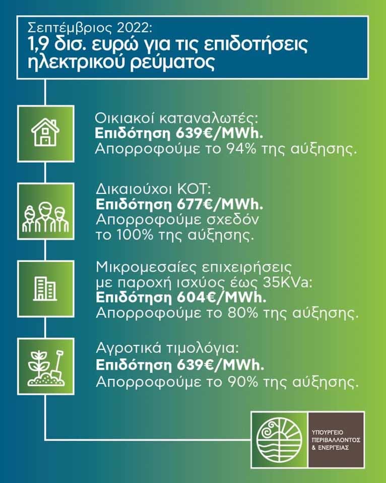 Για τις μικρομεσαίες επιχειρήσεις με παροχή ισχύος μέχρι 35kVA και για όλα τα αρτοποιεία ανεξαρτήτως ισχύος παροχής η επιδότηση ορίστηκε για τον Σεπτέμβριο στα 604 ευρώ/MWh.