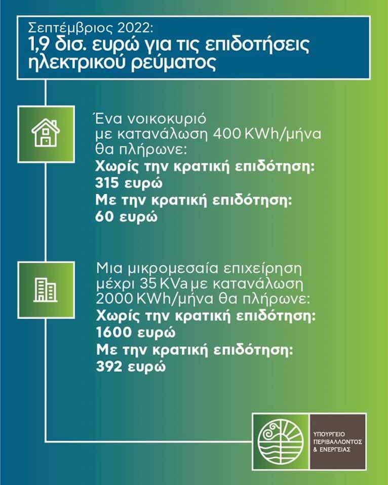 Ένα νοικοκυριό με κατανάλωση 400 KWh/μήνα χωρίς την κρατική επιδότηση θα πλήρωνε 315 ευρώ, ενώ με την κρατική επιδότηση η χρέωση μειώνεται στα 60 ευρώ. Αντίστοιχα, μια μικρομεσαία επιχείρηση με εγκατάσταση ισχύος μέχρι 35 KVa, με κατανάλωση 2.000 KWh/μήνα θα πλήρωνε χωρίς την κρατική επιδότηση 1.600 ευρώ, ενώ με την κρατική επιδότηση θα πληρώσει 392 ευρώ.