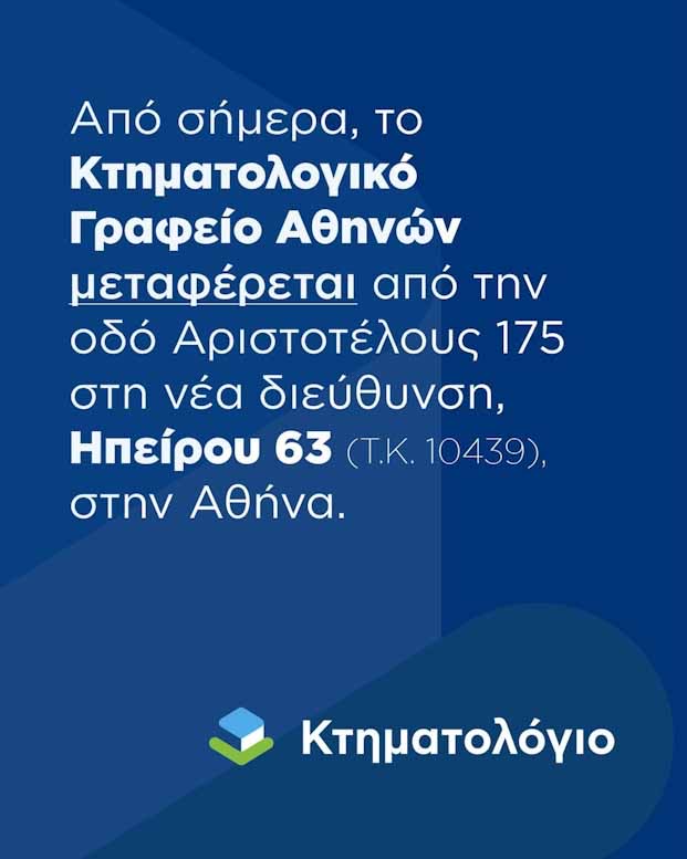 Από σήμερα, το Κτηματολογικό Γραφείο Αθηνών μεταφέρεται σε νέα διεύθυνση: Ηπείρου 63, 10439 Αθήνα.