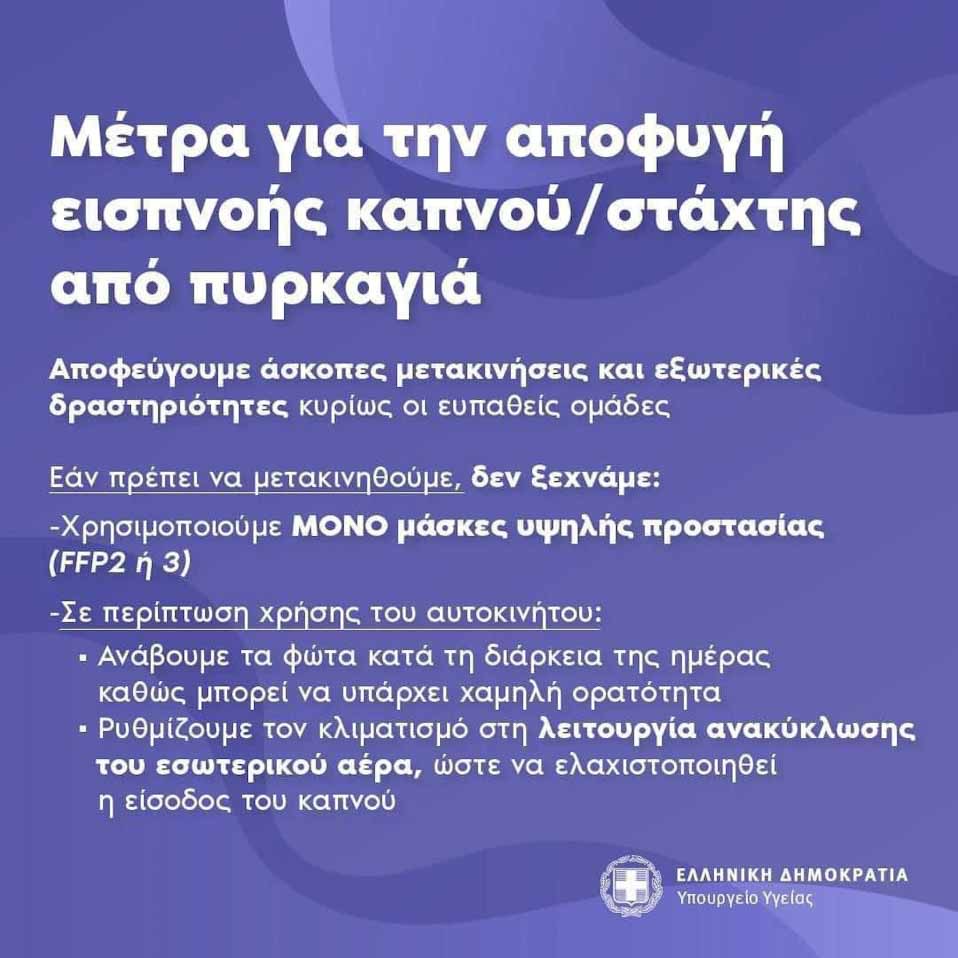 - Σε περίπτωση συνθηκών που ευνοούν την έντονη έκθεση σε καπνό, συστήνεται η απομάκρυνση από την περιοχή, εφόσον είναι εφικτό, για όσο διάστημα το φαινόμενο παραμένει έντονο.