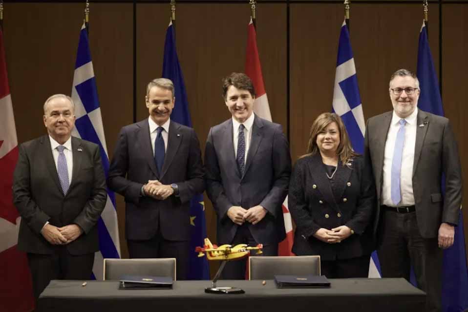 Ο πρωθυπουργός Κυριάκος Μητσοτάκης είχε σήμερα συνάντηση στο Μόντρεαλ με τον Καναδό ομόλογό του Τζάστιν Τριντό, στο πλαίσιο της οποίας επιβεβαιώθηκε η αμοιβαία βούληση για την ενίσχυση των διμερών σχέσεων, με έμφαση στην οικονομική και εμπορική συνεργασία. Μετά την ολοκλήρωση των διευρυμένων συνομιλιών οι δύο πρωθυπουργοί παρέστησαν στην υπογραφή της συμφωνίας απόκτησης επτά νέων υπερσύγχρονων πυροσβεστικών αεροσκαφών, τύπου DHC-515.