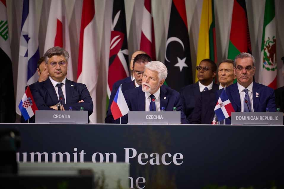 «Αγαπητοί συνάδελφοι, πριν από έναν χρόνο δεν ήταν δεδομένο ότι αυτή η Διάσκεψη για την Ειρήνη θα πραγματοποιούνταν. Η Ρωσία έκανε ό,τι μπορούσε για να την αποτρέψει. Ωστόσο, σήμερα, 101 χώρες και διεθνείς οργανισμοί εκπροσωπούνται σε αυτό το τραπέζι, αποδεικνύοντας, όπως είπε ο Πρωθυπουργός της Ολλανδίας, ότι ο πόλεμος στην Ουκρανία είναι πράγματι ένα παγκόσμιο ζήτημα, για διάφορους λόγους.
