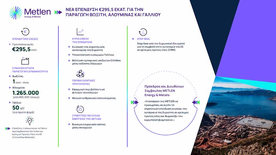 Ο Ευάγγελος Μυτιληναίος, Πρόεδρος και Διευθύνων Σύμβουλος της METLEN, δήλωσε σχετικά: «Η απόφαση της METLEN να προχωρήσει στην υλοποίηση μιας νέας, εμβληματικής βιομηχανικής επένδυσης για την παραγωγή βωξίτη, αλουμίνας και Γαλλίου, ενισχύει την αυτάρκεια της Ευρώπης σε κρίσιμες πρώτες ύλες, αλλά και τη στρατηγική θέση της Ελλάδας στον παγκόσμιο χάρτη. Θωρακίζει ταυτόχρονα την ευρωπαϊκή βιομηχανία από εξωτερικές εξαρτήσεις. Αποδεικνύουμε στην πράξη τη δέσμευσή μας στην καινοτομία, τη βιώσιμη ανάπτυξη και την κυκλική οικονομία, ενώ παράλληλα επιβεβαιώνουμε σταθερά ότι η METLENμπορεί να έχει πρωταγωνιστικό μας ρόλο στη μετάβαση προς μια πιο «πράσινη» και ανθεκτική βιομηχανική παραγωγή.»