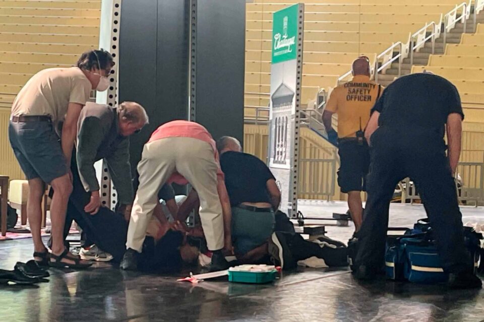 Ένας άνδρας όρμησε στη σκηνή την ώρα που ο Ρούσντι ετοιμαζόταν να εκφωνήσει ομιλία για την καλλιτεχνική ελευθερία και μαχαίρωσε στον λαιμό τον 75χρονο συγγραφέα, ο οποίος σωριάστηκε στο πάτωμα.