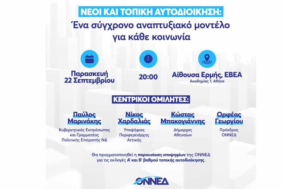 Η εκδήλωση της ΟΝΝΕΔ «Νέοι και τοπική αυτοδιοίκηση: Ένα σύγχρονο αναπτυξιακό μοντέλο για κάθε κοινωνία», θα πραγματοποιηθεί την Παρασκευή 22 Σεπτεμβρίου και ώρα 20:00, στην αίθουσα «Ερμής» του Εμπορικού και Βιομηχανικού Επιμελητηρίου Αθηνών (Ακαδημίας 7, Αθήνα).