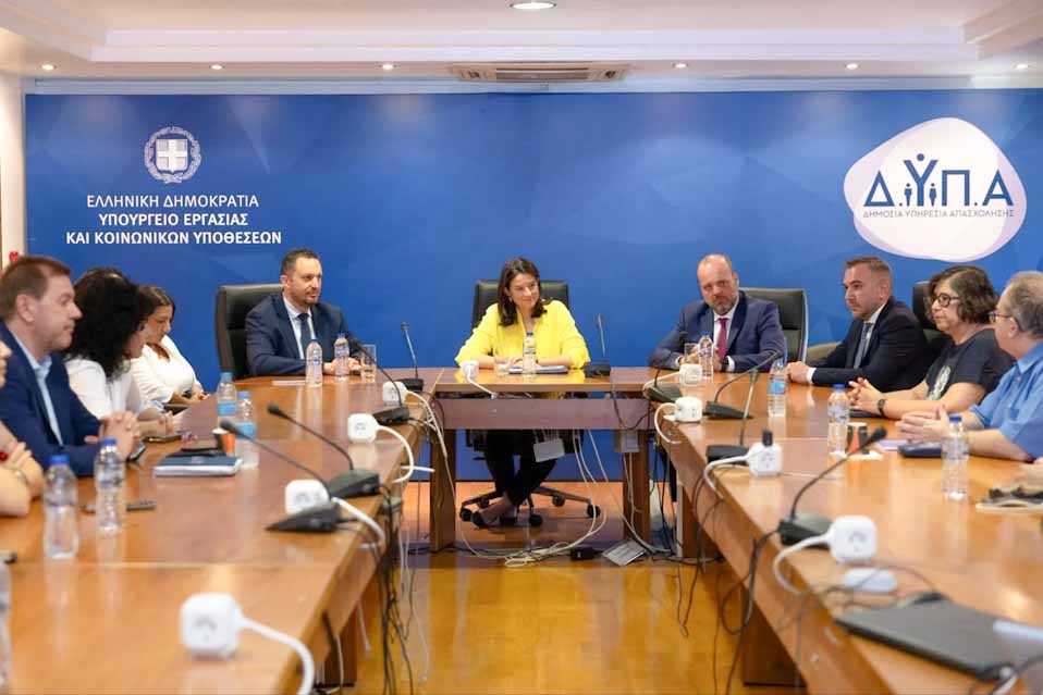Η Υπουργός ενημερώθηκε για την πορεία υλοποίησης των δράσεων της ΔΥΠΑ από τον Διοικητή Σπύρο Πρωτοψάλτη και συνομίλησε με τους Υποδιοικητές Γιώργο Καραχάλιο, Γιάννα Χορμόβα και Βασίλη Γεωργιάδη, τους Γενικούς Διευθυντές, τους Διευθυντές και άλλα στελέχη της ΔΥΠΑ, καθώς και με τους εκπροσώπους των εργαζομένων.