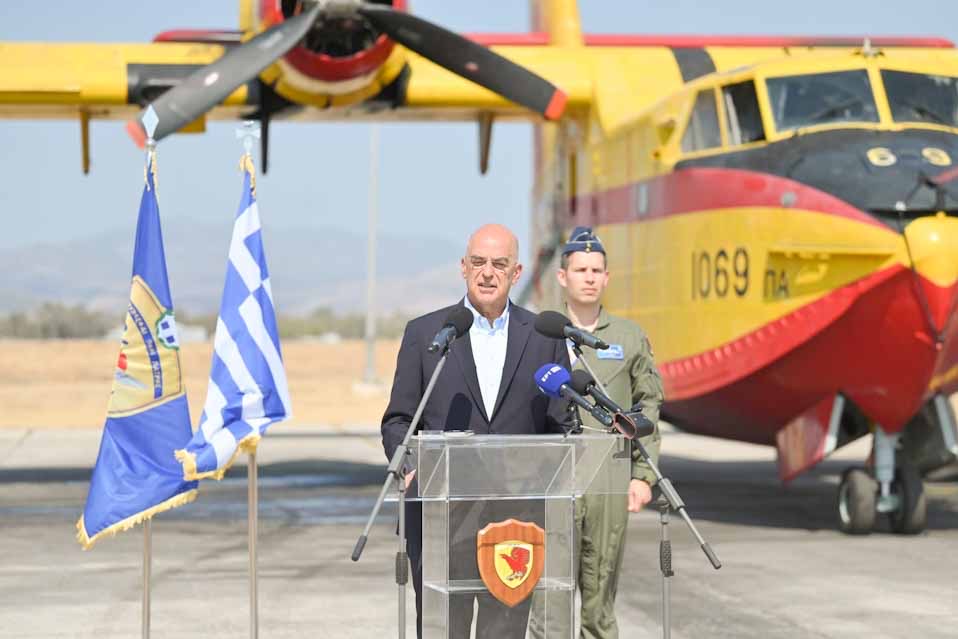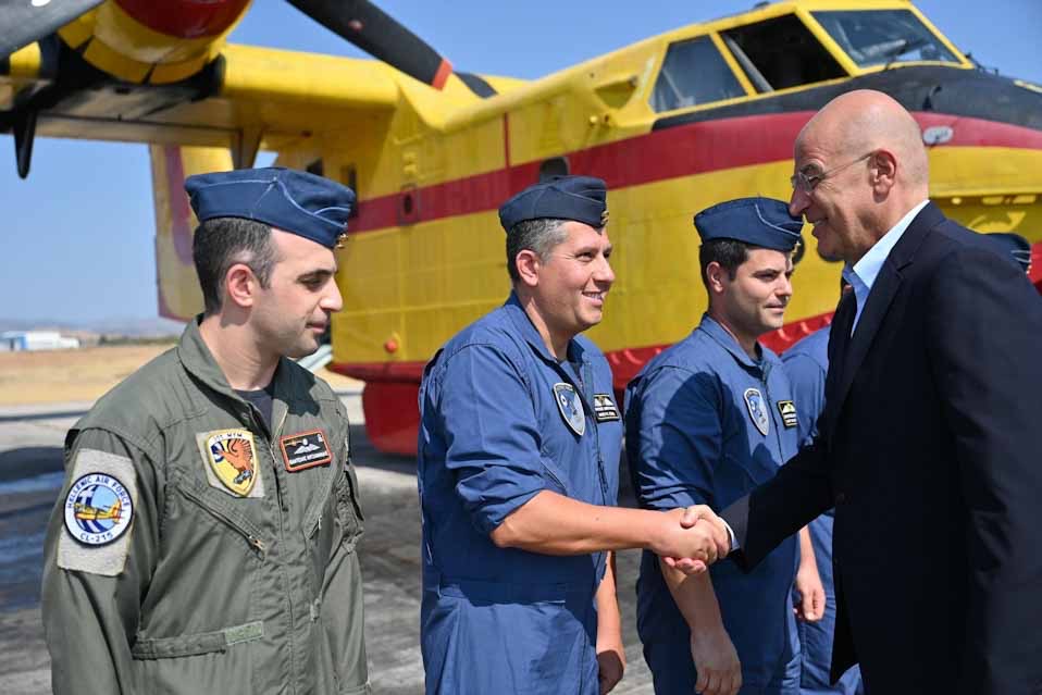 Βρισκόμαστε, κυρίες και κύριοι, στην έδρα της προσπάθειας αεροπυρόσβεσης στην Πατρίδα μας, στην κύρια βάση των αεροσκαφών CL-215 και CL-415. Αυτά τα αεροσκάφη είναι ο κύριος βραχίονας στην προσπάθεια της προστασίας του κοινωνικού συνόλου, σε μια «μάχη» άνιση, κατά των συνθηκών που έχει δημιουργήσει η περιβαλλοντική αλλαγή και των προκλήσεων που αντιμετωπίζονται κάθε ημέρα, κάθε ώρα, κάθε στιγμή. Κατ’ αρχάς στον ελληνικό χώρο, αλλά επίσης και σε πολλές άλλες χώρες της ευρύτερης περιφέρειάς μας, στο Ισραήλ, στη Βόρεια Μακεδονία, στην Αλβανία, στην ευρύτερη περιοχή. Χώρες που έχουμε επανειλημμένα βοηθήσει να αντιμετωπίσουν ανάλογες προκλήσεις.