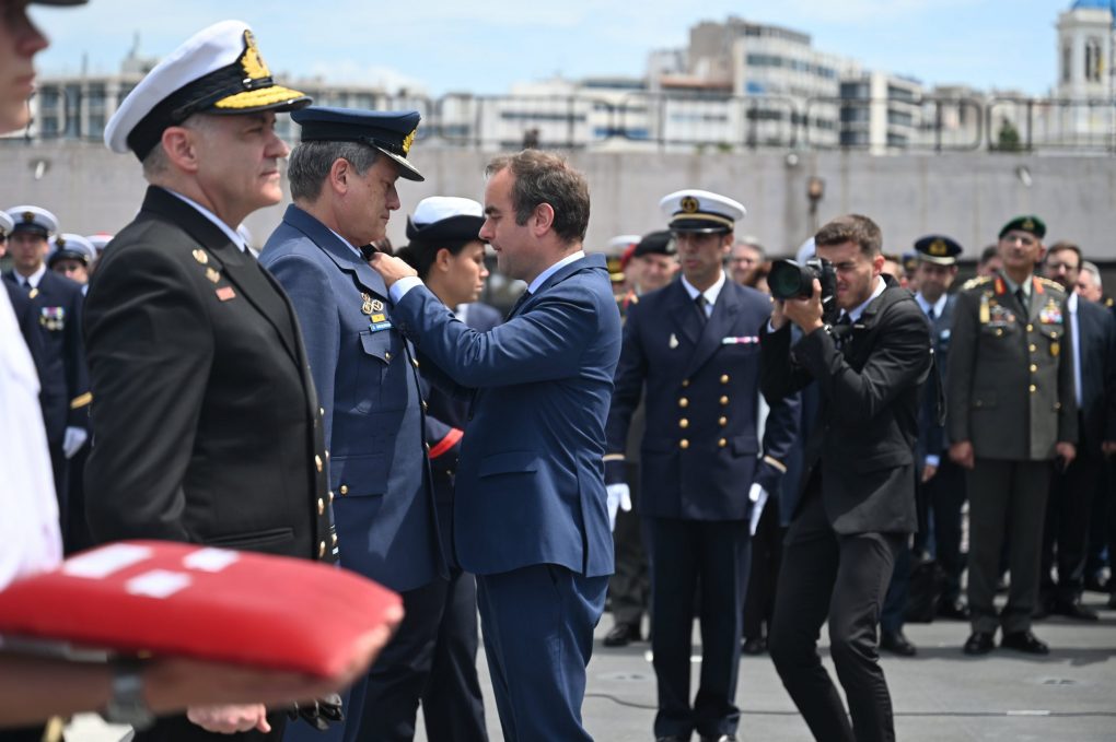 Πρέπει να σας πω όμως ότι νιώθω εξαιρετικά άνετα να βρίσκομαι πάνω σε ένα γαλλικό πολεμικό πλοίο. Όχι μόνο εξαιτίας της εξαιρετικής φιλοξενίας που εμείς οι Έλληνες απολαμβάνουμε από τον πλοίαρχο και το πλήρωμα του πλοίου, όχι μόνο για την εγκαρδιότητα της σχέσης που είναι προφανής σε όλους, αλλά και διότι βλέπω πως θεμελιώνεται σε όλο και πιο στέρεες βάσεις η συνεργασία ανάμεσα στο ελληνικό και στο γαλλικό Πολεμικό Ναυτικό, αναμεσά στις ελληνικές και τις γαλλικές Ένοπλες Δυνάμεις.