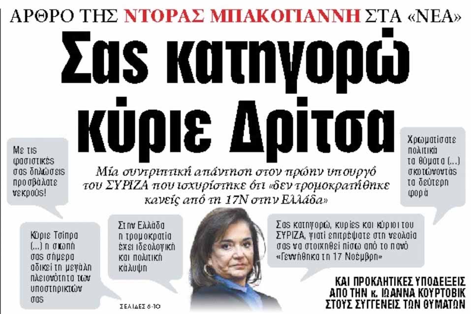 Με άρθρο της στην εφημερίδα «ΤΑ ΝΕΑ», με τίτλο «Ποια δημοκρατία θέλουμε επιτέλους;», η βουλευτής της ΝΔ Ντόρα Μπακογιάννη απαντά στις δηλώσεις του βουλευτή του ΣΥΡΙΖΑ Θοδωρή Δρίτσα, σχετικά με την τρομοκρατική οργάνωση 17Ν.
