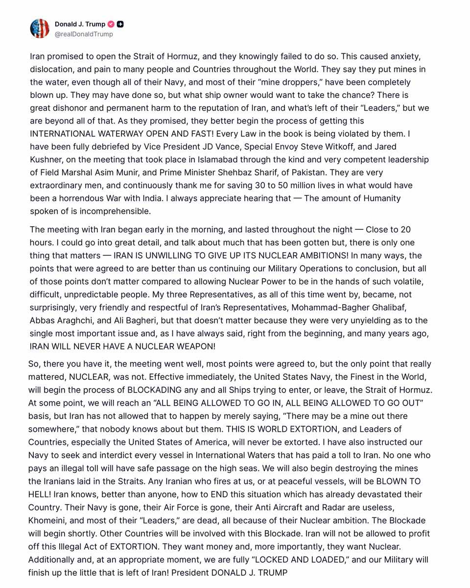 «Με άμεση ισχύ, το Πολεμικό Ναυτικό των Ηνωμένων Πολιτειών, το Καλύτερο στον Κόσμο, θα αρχίσει τη διαδικασία του ΑΠΟΚΛΕΙΣΜΟΥ όλων των πλοίων που επιχειρούν να εισέλθουν ή να εξέλθουν από τα στενά του Ορμούζ», πρόσθεσε στο Truth Social.