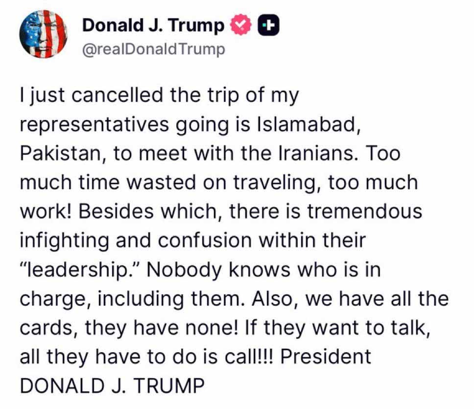 Την ίδια ώρα, ο Ντόναλντ Τραμπ δήλωσε ότι “κανείς δεν ξέρει ποιος είναι επικεφαλής” στο Ιράν, αφότου ακύρωσε το ταξίδι του ειδικού του απεσταλμένου Στιβ Γουίτκοφ και του γαμπρού του Τζάρεντ Κούσνερ στο Ισλαμαμπάντ για συνομιλίες με την Τεχεράνη, επικαλούμενος “τεράστια σύγχυση στην ιρανική ηγεσία”.