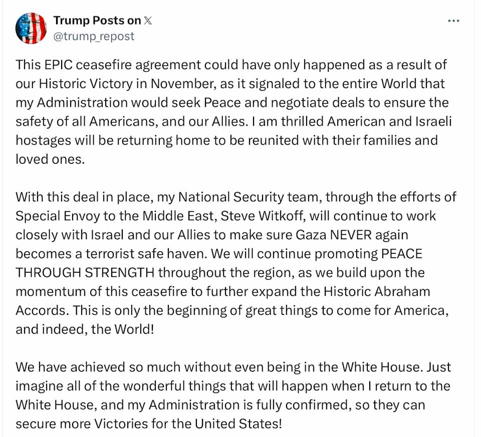 «Έχουμε συμφωνία για τους ομήρους στη Μέση Ανατολή. Θα απελευθερωθούν σύντομα», γνωστοποίησε πριν από λίγη ώρα ο εκλεγμένος πρόεδρος των ΗΠΑ Ντόναλντ Τραμπ μέσω ανάρτησής του στην πλατφόρμα κοινωνικής δικτύωσης Truth Social, προτού ακόμη ο σημερινός ένοικος του Λευκού Οίκου προβεί σε οποιαδήποτε ανακοίνωση σχετικά με το θέμα.