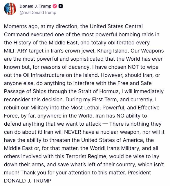 «Για λόγους ευπρέπειας, επέλεξα να μην εξαλείψω τις «υποδομές πετρελαίου στο νησί», έγραψε ο πρόεδρος των ΗΠΑ στο Truth Social, προειδοποιώντας: «Εάν το Ιράν ή οποιοσδήποτε άλλος κάνει ο,τιδήποτε που να παρεμποδίζει την ελεύθερη και ασφαλή διέλευση των πλοίων μέσω του Στενού του Ορμούζ, θα επανεξετάσω άμεσα την απόφαση σχετικά με τις πετρελαϊκές υποδομές». Στην ίδια ανάρτηση ο αμερικανός πρόεδρος επαναλαμβάνει ότι « το Ιράν δεν θα αποκτήσει ποτέ πυρηνικά όπλα και δεν θα έχει ποτέ την δύναμη να απειλήσει τις ΗΠΑ, τη Μέση Ανατολή ή άλλο σημείο του πλανήτη».