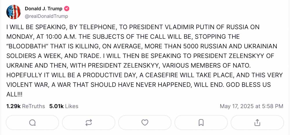 «ΤΑ ΘΕΜΑΤΑ ΤΟΥ ΤΗΛΕΦΩΝΗΜΑΤΟΣ ΘΑ ΕΙΝΑΙ ΝΑ ΣΤΑΜΑΤΗΣΕΙ ΤΟ ΛΟΥΤΡΟ ΑΙΜΑΤΟΣ ΠΟΥ ΣΚΟΤΩΝΕΙ ΚΑΤΑ ΜΕΣΟ ΟΡΟ ΠΕΡΙΣΣΟΤΕΡΟΥΣ ΑΠΟ 5.000 ΡΩΣΟΥΣ ΚΑΙ ΟΥΚΡΑΝΟΥΣ ΣΤΡΑΤΙΩΤΕΣ ΤΗΝ ΕΒΔΟΜΑΔΑ, ΚΑΙ ΤΟ ΕΜΠΟΡΙΟ», δήλωσε σε ανάρτησή του στο Truth Social