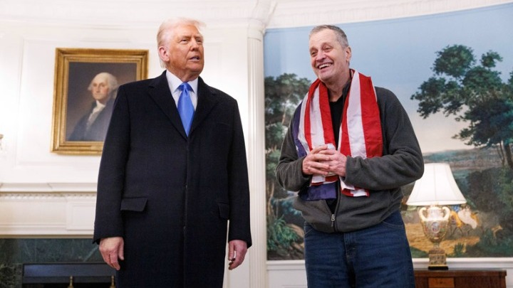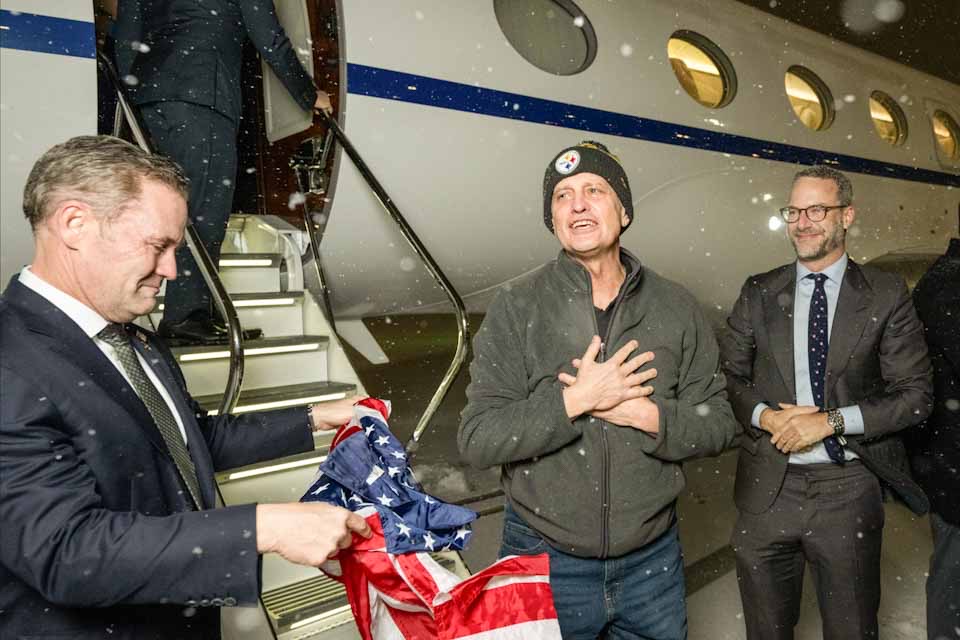 Έχοντας ρίξει στους ώμους του μια αμερικανική σημαία, ο 63χρονος εκπαιδευτικός, φανερά συγκινημένος, είπε ότι αισθάνεται πως είναι «ο πιο τυχερός άνθρωπος στη γη» και ευχαρίστησε τον αμερικανό πρόεδρο και την ομάδα του από τη «διπλωματική αίθουσα» του Λευκού Οίκου.
