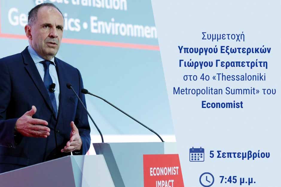 Ο Υπουργός Εξωτερικών, Γιώργος Γεραπετρίτης, θα είναι ο κεντρικός ομιλητής αύριο, Πέμπτη 5 Σεπτεμβρίου, στο δείπνο του 4ου «Thessaloniki Metropolitan Summit» του Economist.