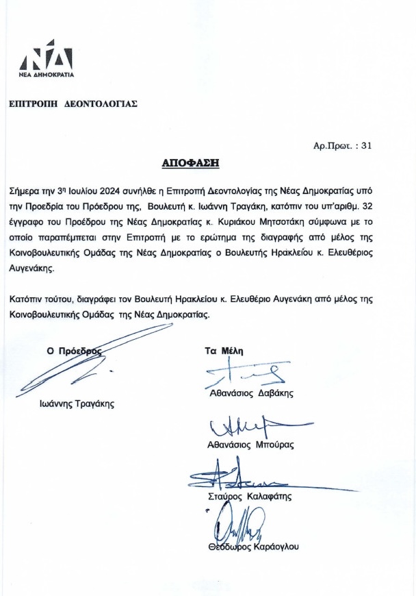 Εκτός της Κοινοβουλευτικής Ομάδας της ΝΔ, έθεσε τον βουλευτή Ηρακλείου, Λευτέρη Αυγενάκη, ο πρόεδρος του κόμματος, Κυριάκος Μητσοτάκης, με επιστολή του στον πρόεδρο της Βουλής.