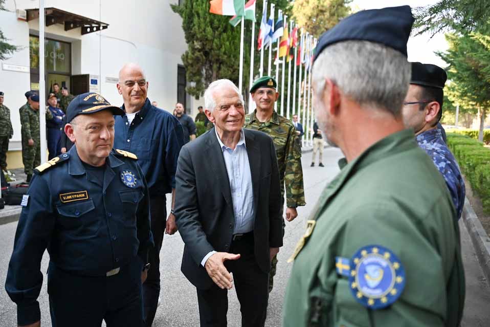 Ακολούθως, οι κ.κ. Δένδιας και Borrell, μετέβησαν στη Λάρισα, όπου επισκέφτηκαν το Στρατηγείο της Επιχείρησης «ΑΣΠΙΔΕΣ» (OHQ EUNAVFOR ASPIDES) στην 1η Στρατιά /EU-ΟHQ «ΑΧΙΛΛΕΑΣ», συνοδευόμενοι από τον Αρχηγό ΓΕΕΘΑ Στρατηγό Δημήτριο Χούπη και τον Αρχηγό ΓΕΝ Αντιναύαρχο Δημήτριο – Ελευθέριο Κατάρα ΠΝ.