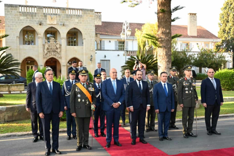 «Στο Προεδρικό Μέγαρο της Λευκωσίας, με τον Πρόεδρο της Κυπριακής Δημοκρατίας Νίκο Χριστοδουλίδη, συνοδευόμενος από τον αρχηγό ΓΕΕΘΑ Κωνσταντίνο Φλώρο, όπου κατέθεσα στέφανο στον ανδριάντα του Αρχιεπισκόπου Μακαρίου Γ’, ανήμερα της επετείου των 63 ετών της Ανεξαρτησίας της Κύπρου» αναφέρει ο κ. Δένδιας.