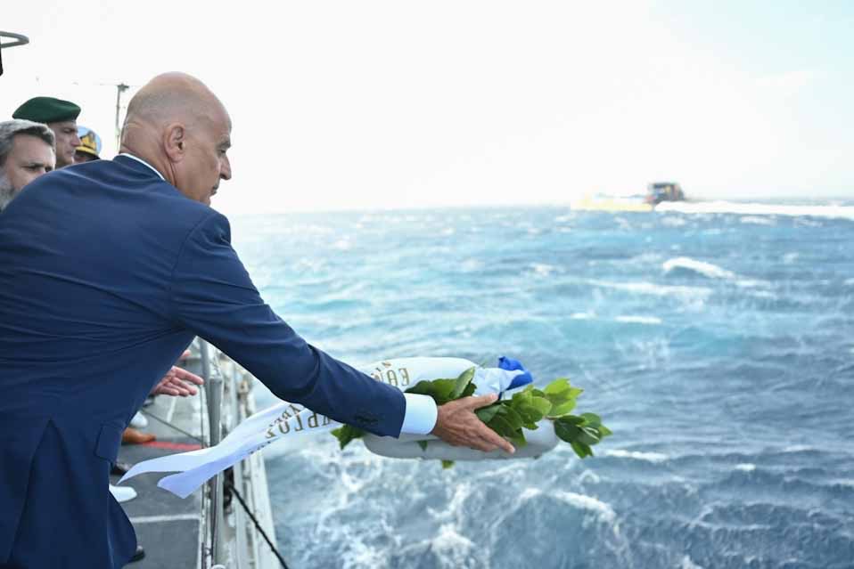 Ο κ. Δένδιας, συνοδευόμενος από τον Αρχηγό ΓΕΕΘΑ Στρατηγό Δημήτριο Χούπη και τον Αρχηγό ΓΕΝ Αντιναύαρχο Δημήτριο – Ελευθέριο Κατάρα ΠΝ, επιβιβάστηκε στην ΤΠΚ «ΜΥΚΟΝΙΟΣ» του Πολεμικού Ναυτικού, που έπλευσε στη θαλάσσια περιοχή βύθισης του Κ/Δ «ΕΛΛΗ». Ακολούθησε η επιμνημόσυνη δέηση για τους πεσόντες και η ρίψη στεφάνων από τον Υπουργό Εθνικής Άμυνας και τον Αρχηγό ΓΕΕΘΑ. Στο σημείο που έπλευσε η ΤΠΚ «ΜΥΚΟΝΙΟΣ» ναυλοχεί τιμητικά η Φ/Γ «ΑΙΓΑΙΟΝ».